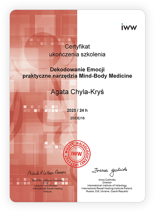 Pomagam odkrywać emocjonalne przyczyny dolegliwości, by uruchomić proces głębokiego zrozumienia i uzdrawiania siebie.